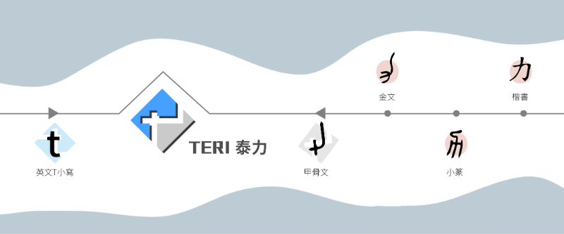 泰力的英文名稱為「Teri」,我們將女性英文名 " Teri " 中的小寫「t」以及漢字「力」最早的象形文字(甲骨文)相結合,象徵著Teri泰力剛柔並濟的精神。