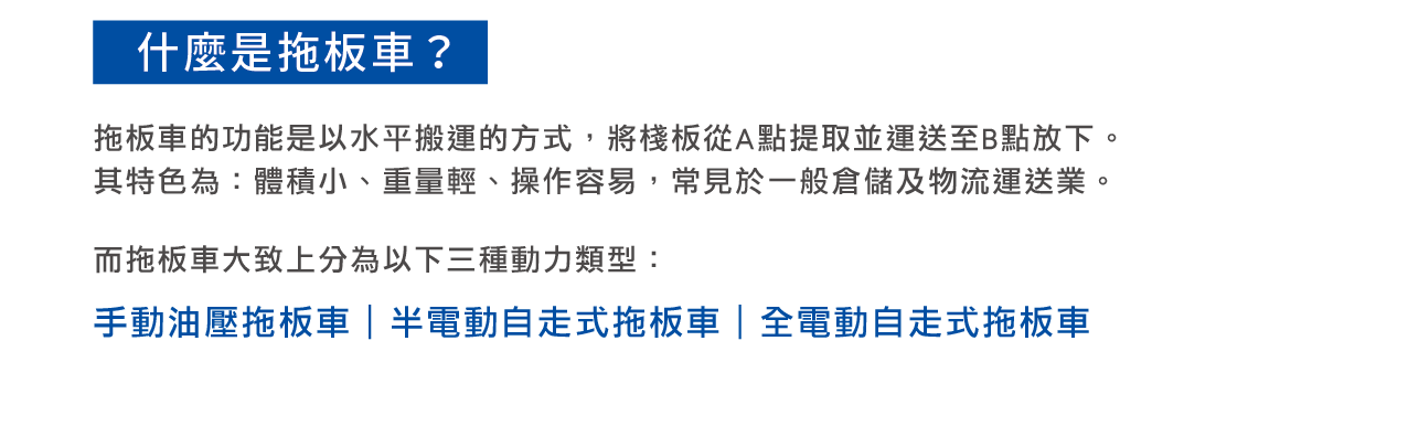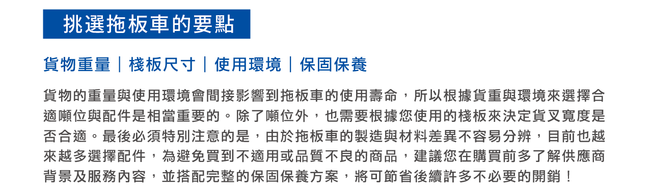 選擇適合的拖板車,不僅能提升工作效率,還能降低操作風險,讓搬運變得更輕鬆安全。