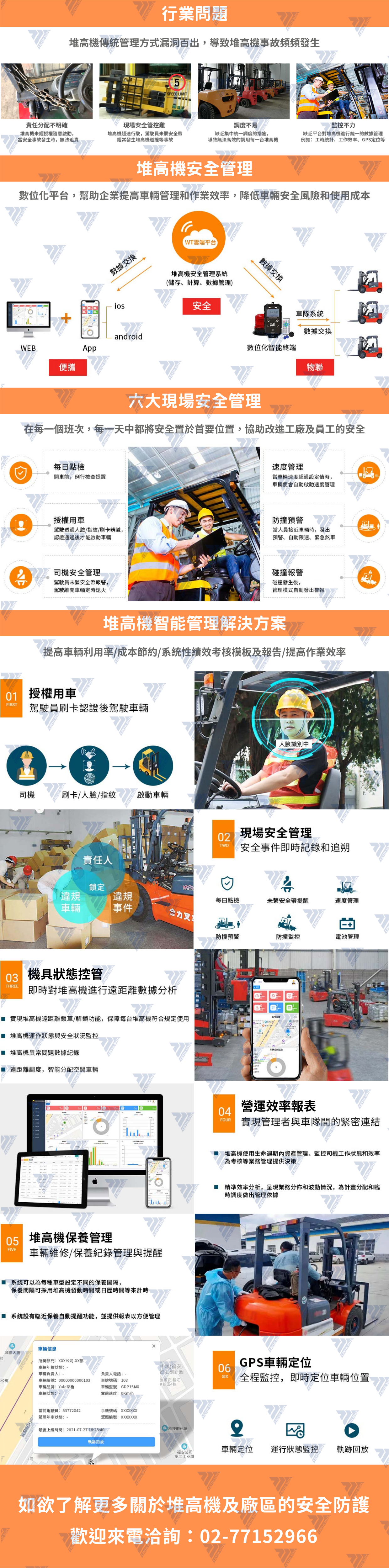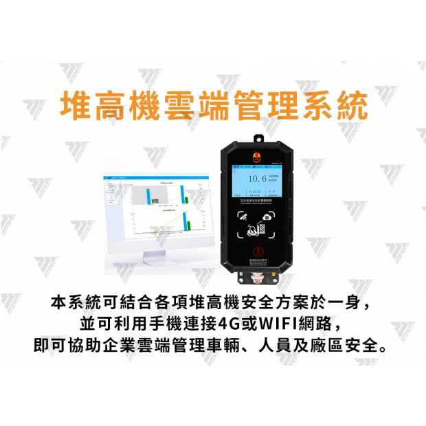 本系統可結合各項堆高機安全方案於一身,並可利用手機連接4G或WIFI網路,即可協助企業雲端管理車輛、人員及廠區安全。