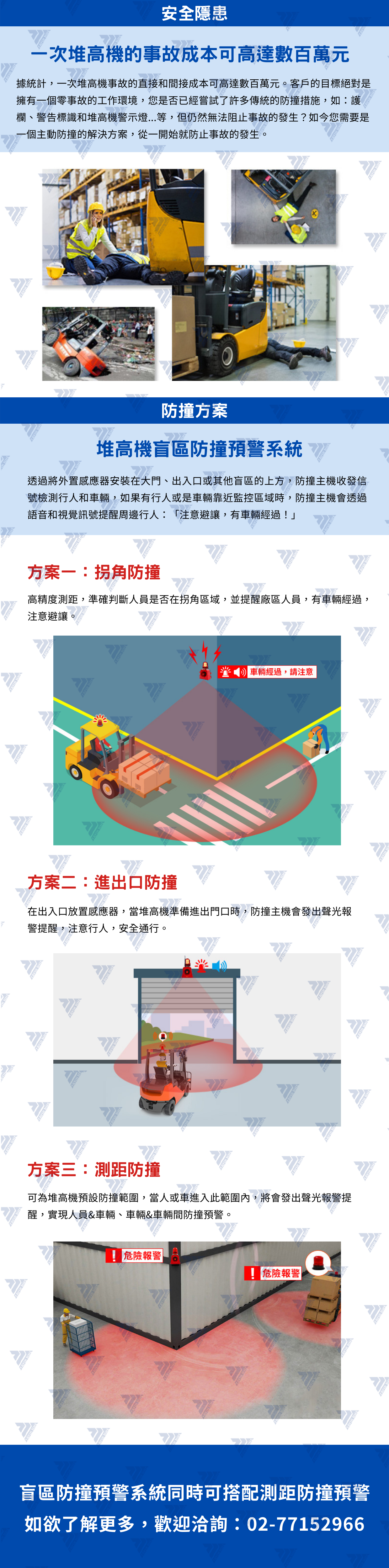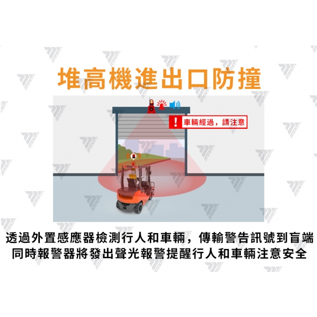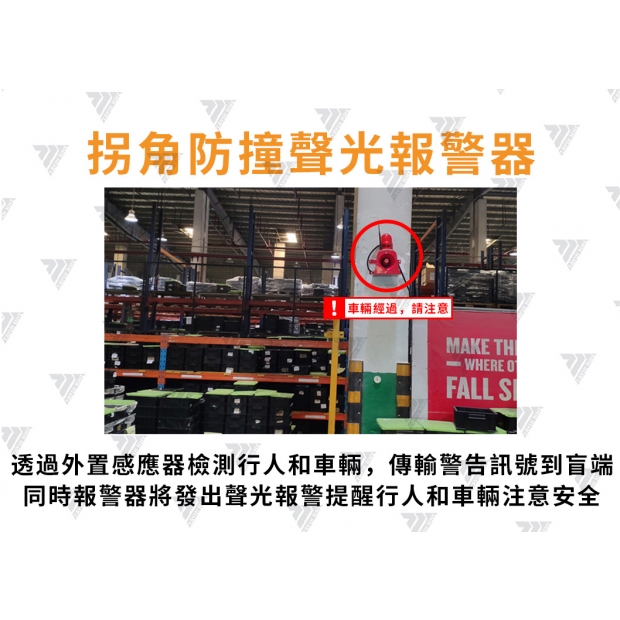 拐角防撞聲光報警器:當人員與車輛等移動物體進入感應範圍內,將提前感應預警,透過燈光閃爍和語音警報,提示周遭人與車注意安全;