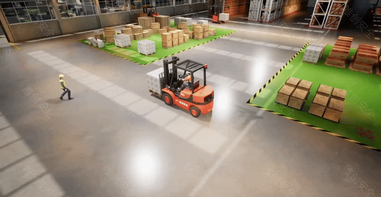 360°防撞預警:同一區域實現堆高機與人員、堆高機與堆高機之間的安全距離報警;