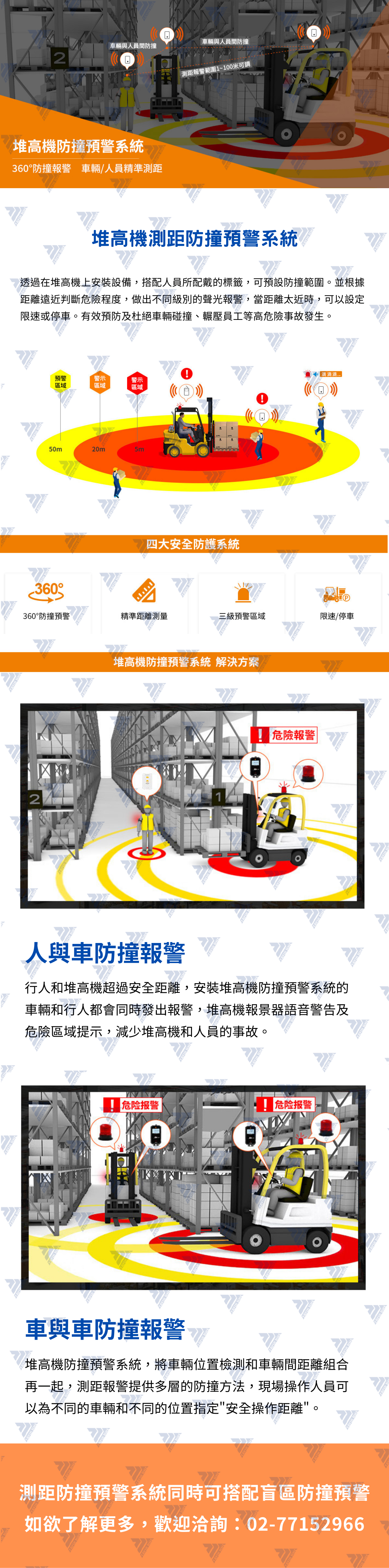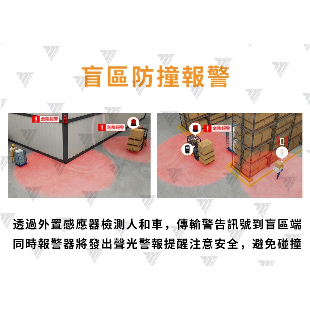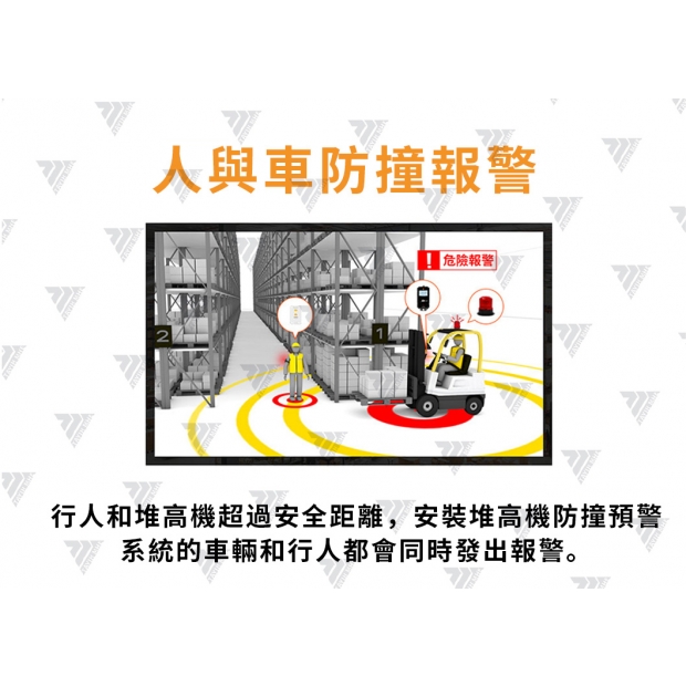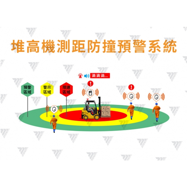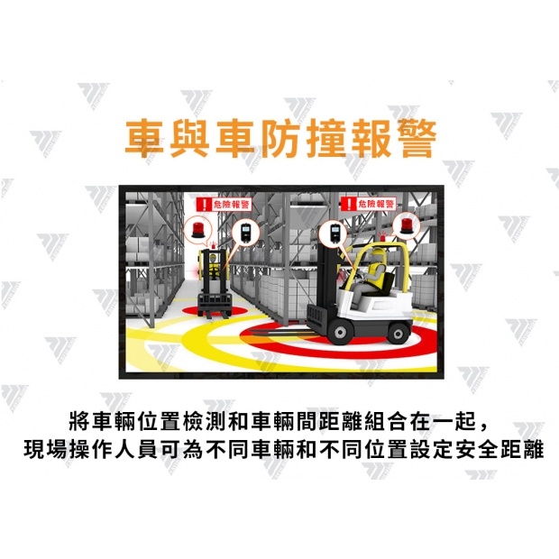 採用UWB無線測距技術,360°防撞預警,預防撞車撞人;可為堆高機預設防撞範圍,